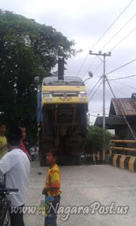 Nasib naas di alami sopir truk dengan plat DA 1096 DB, ketika naik jembatan jumping dan terangkat seperti gambar di bawah ini.