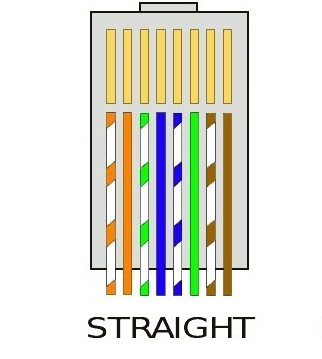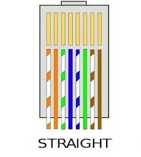 Dimulai dari sebelah kiri dengan posisi pin kuningan rj45 diatas, urutan kabel lan straight yang benar adalah ;